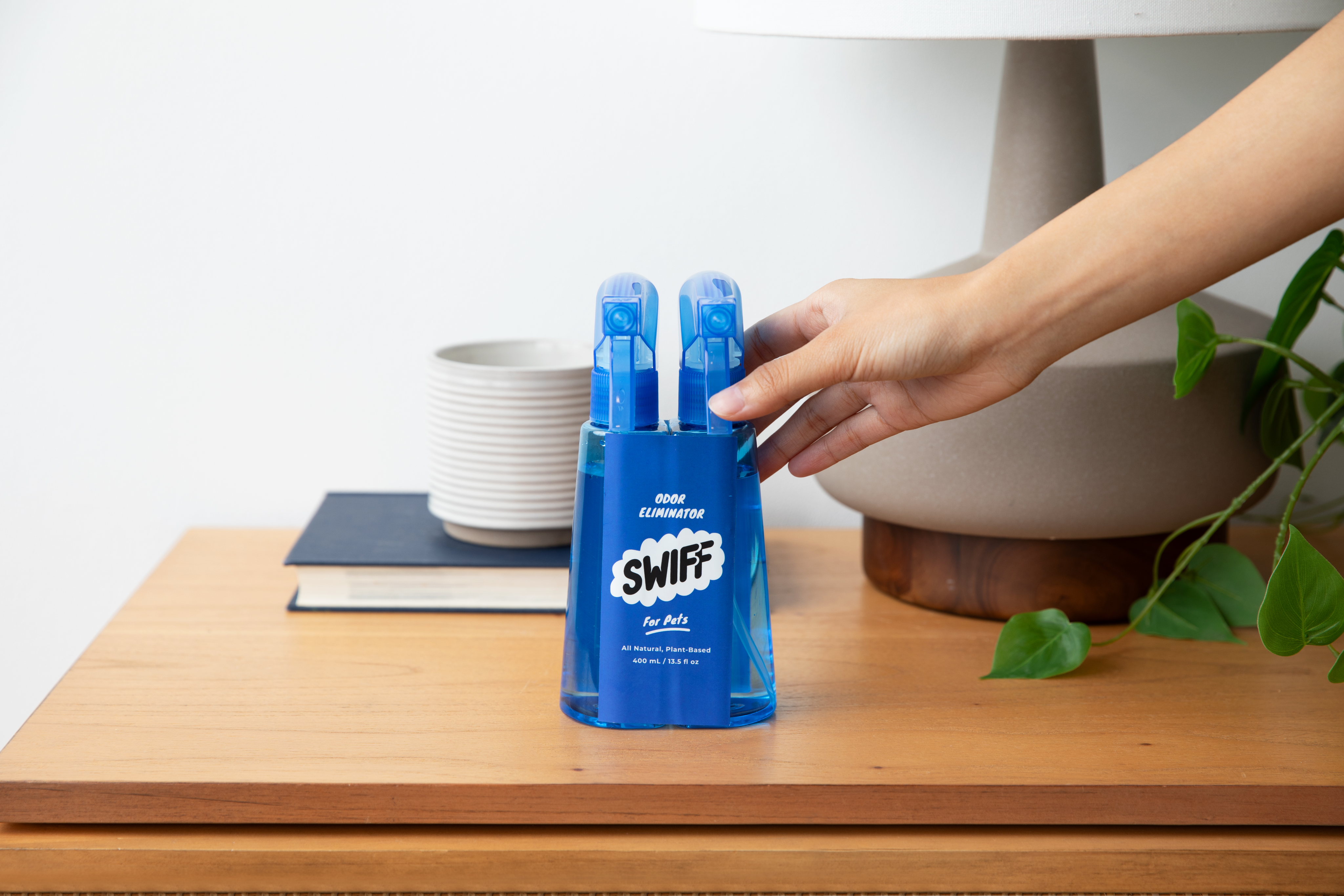 SWIFF Pets has a larger surface spray and volume, which means you can cover large areas in minimal time and effort. Think large areas like: pet beds, sofas, rugs, beds, etc.