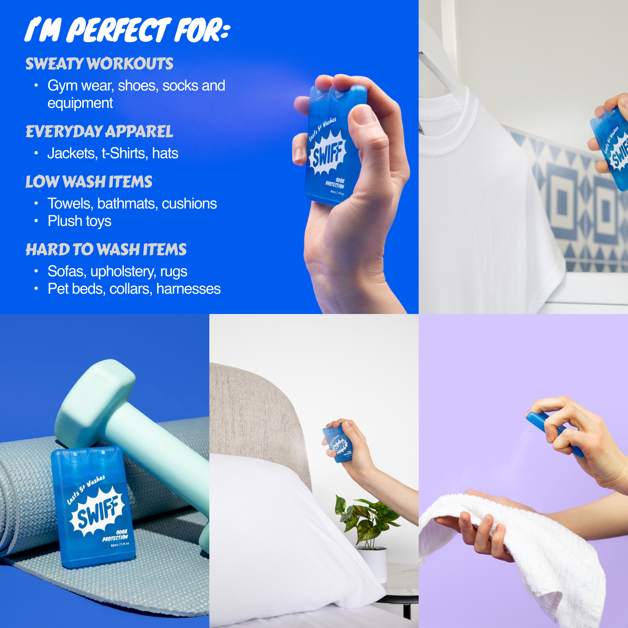 SWIFF & Go kills odor-causing germs, stopping smells before they start! Simply SWIFF any fabric to eliminate the odour instantly and keep it fresh for weeks (even after washing).